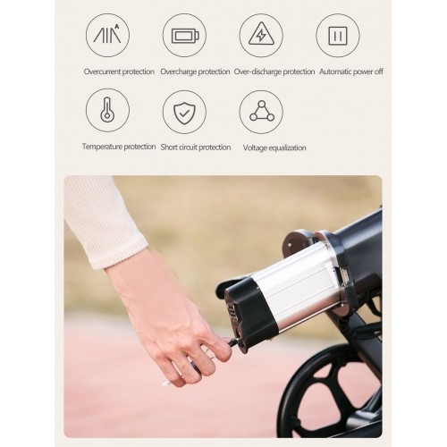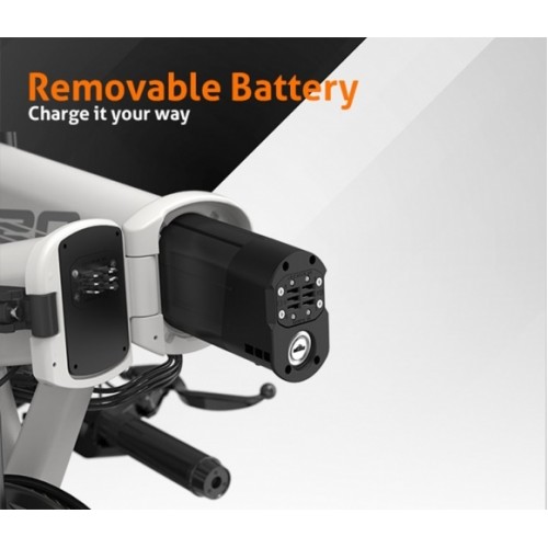 Turi 10Ah 36V bateriją, kuri nuo 0 iki 100 proc. įkraunama per maždaug 5 val. Baterija yra paslėpta ir patalpinta dviračio rėme, turi saugų užraktą, tad būsite dėl jos saugūs dviratį trumpam palikę be priežūros. Bateriją galima išimti ir nusinešti pakrauti į namus, nenešant pačio dviračio iki maitinimo šaltinio. Palaiko 3 važiavimo režimus: vien elektra nuvažiuosite apie 50 km., o drauge mindami pedalus - iki 80 km. Galima naudoti ir be elektros variklio, tiesiog kaip paprastą dviratį. Maksimalus greitis važiuojant elektra - 25 km/h.