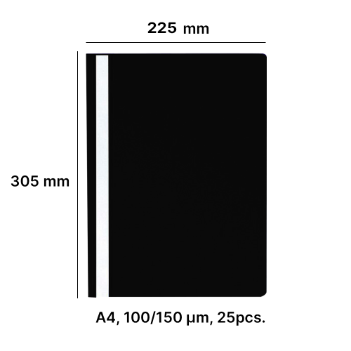 Medžiaga: PP (polipropilenas). Tinka A4 dokumentams. Atverčiama pusė: dešinė. Storis: priekis - 100 mikronų, apačia - 170 mikronų. Antistatiškas ir be atspindžių. Matmuo: 305x225mm (LxW). Spalva: priekis - skaidrus, apačia - juoda. Transporto pakuotė: plastikiniame maišelyje - 25 vnt., dėžutė - 400 vnt, EUR padėklas - 24 000 vnt.
