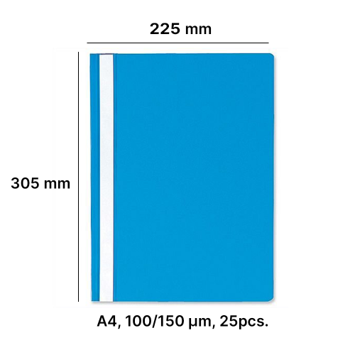 Medžiaga: PP (polipropilenas). Tinka A4 dokumentams. Atverčiama pusė: dešinė. Storis: priekis - 100 mikronų, apačia - 170 mikronų. Antistatiškas ir be atspindžių. Matmuo: 305x225mm (LxW). Spalva: priekis - skaidrus, apačia - juoda. Transporto pakuotė: plastikiniame maišelyje - 25 vnt., dėžutė - 400 vnt, EUR padėklas - 24 000 vnt.