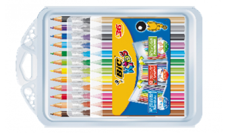 "Patogus plastikinis dėklas; Trys skirtingos spalvinimo priemonės vienoje pakuotėje: Kind Couleur flomasteriai; Evolution Ecolutions spalvinimo pieštukai; Plastidecor kreidelės; iš viso 36 spalvinimo priemonių vienetai. "