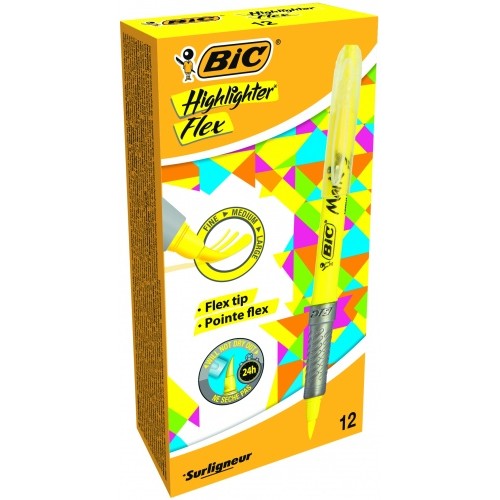 BIC Highlighter Flex. Kiekis pakuotėje: 12 vnt, Rašiklio spalvos: Geltona, Antgalio tipas: Storas antgalis. Pakuotės tipas: „Box“